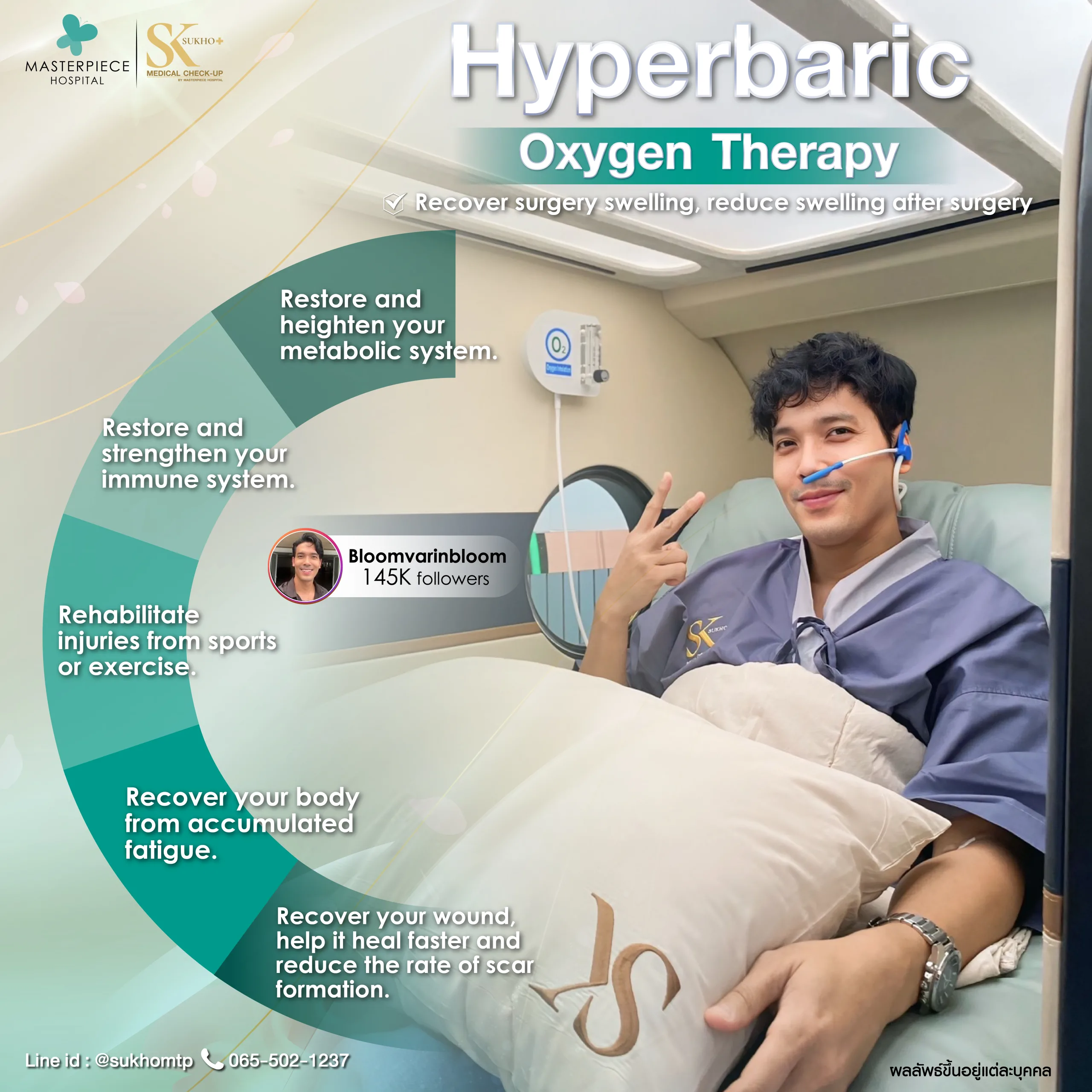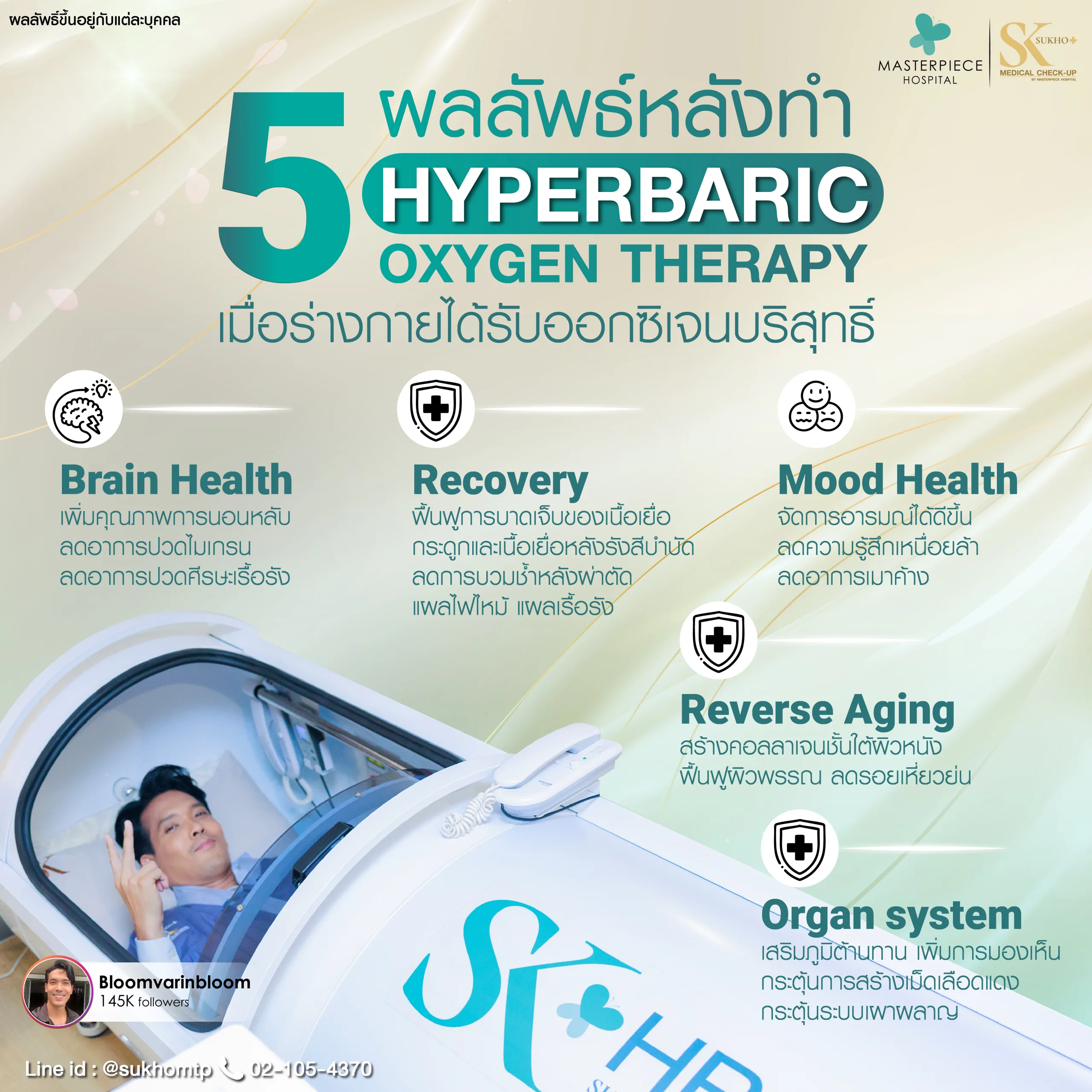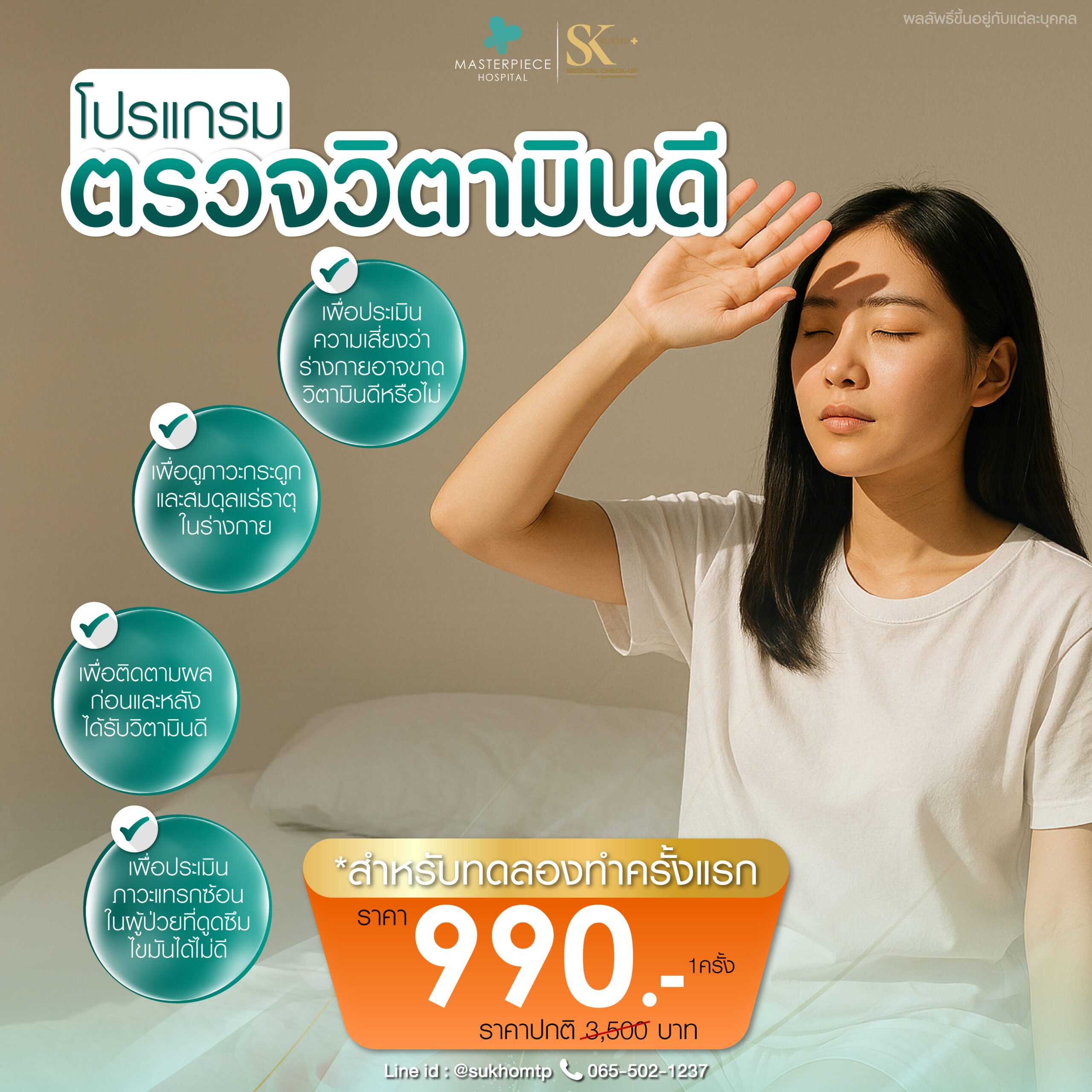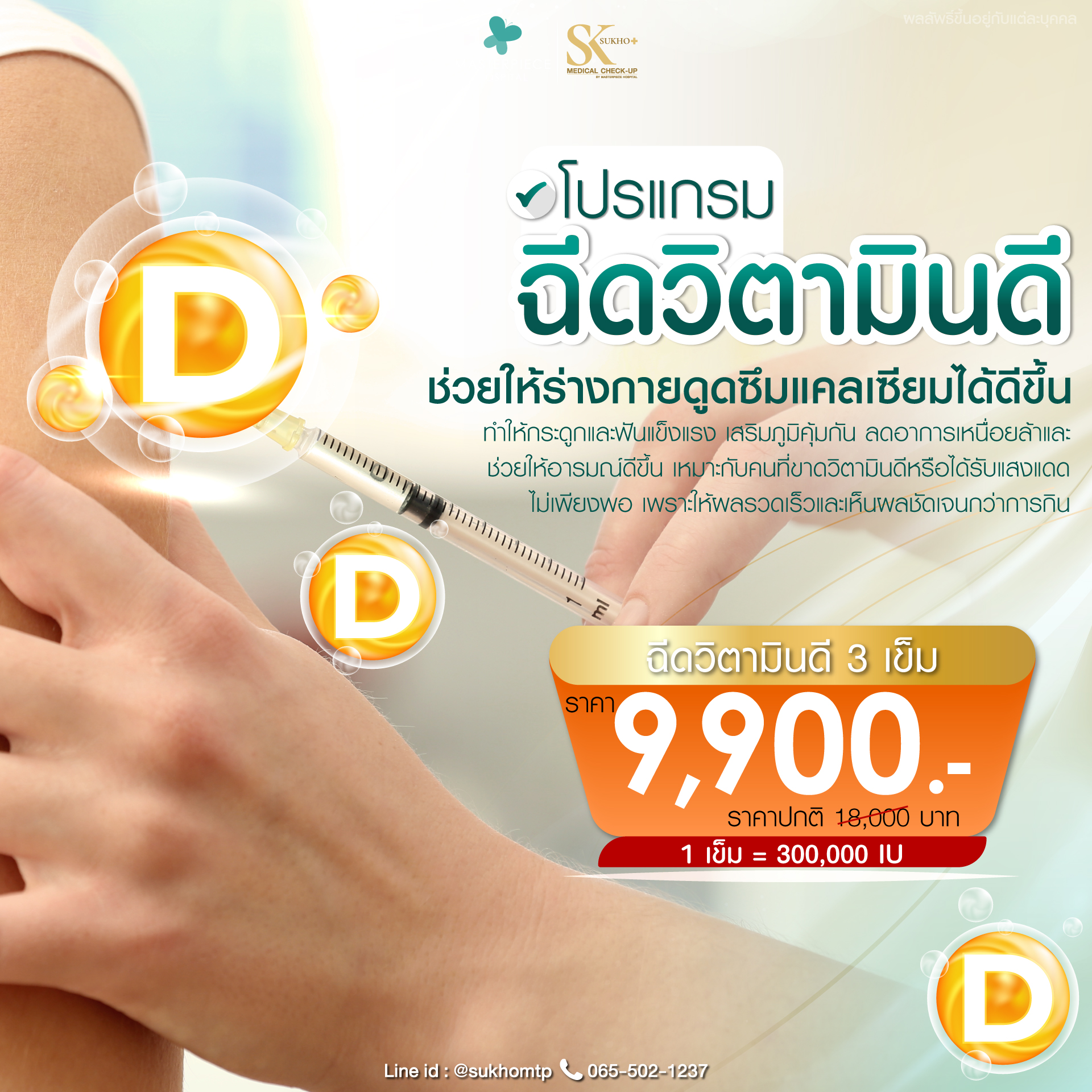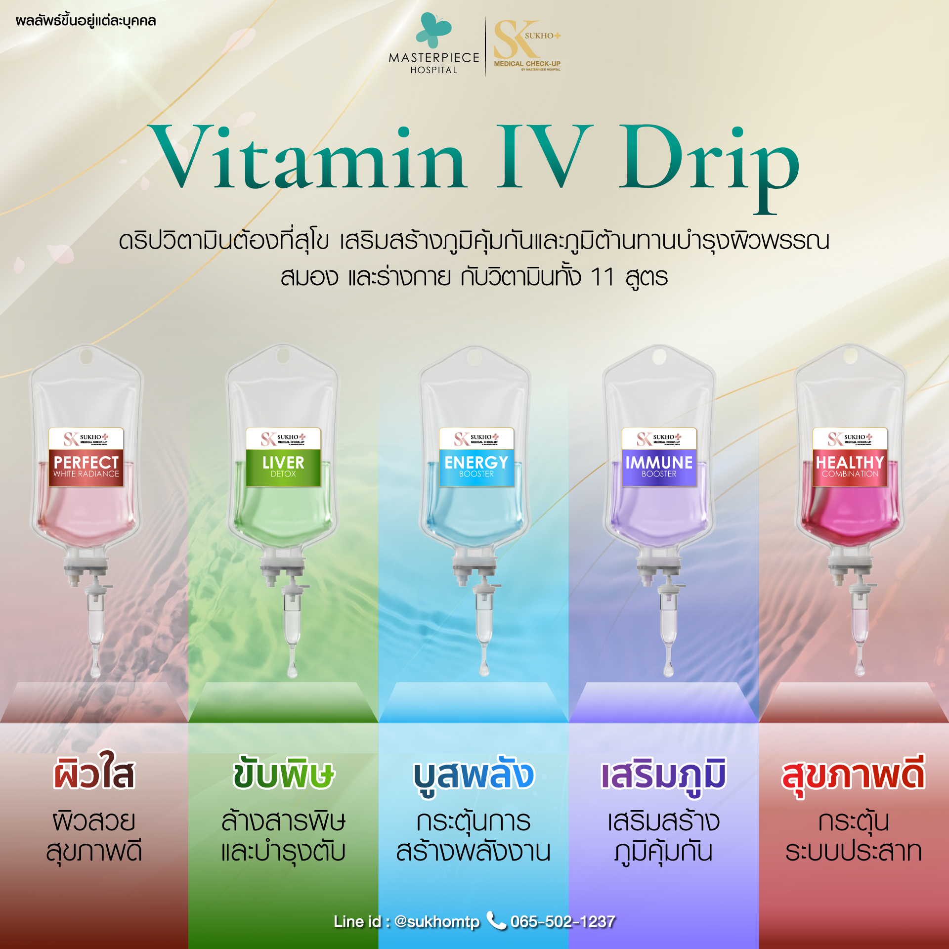 เติมเต็มพลังชีวิตด้วย Vitamin drip ที่ช่วยฟื้นฟูร่างกายแบบเร่งด่วน พร้อมด้วย Hyperbaric Oxygen Therapy (HBOT) ที่จะทำให้คุณรู้สึกสดชื่นและทำงานได้ดีขึ้น นอกจากนี้ เรายังมีบริการตรวจภูมิแพ้อาหารแฝง เพื่อให้คุณรู้จักตัวเองและเลือกทานอาหารได้อย่างเหมาะสม ที่โรงพยาบาลมาสเตอร์พีช เราใส่ใจสุขภาพคุณทุกขั้นตอน มาสัมผัสประสบการณ์ดูแลสุขภาพที่ดีกับเราวันนี้!